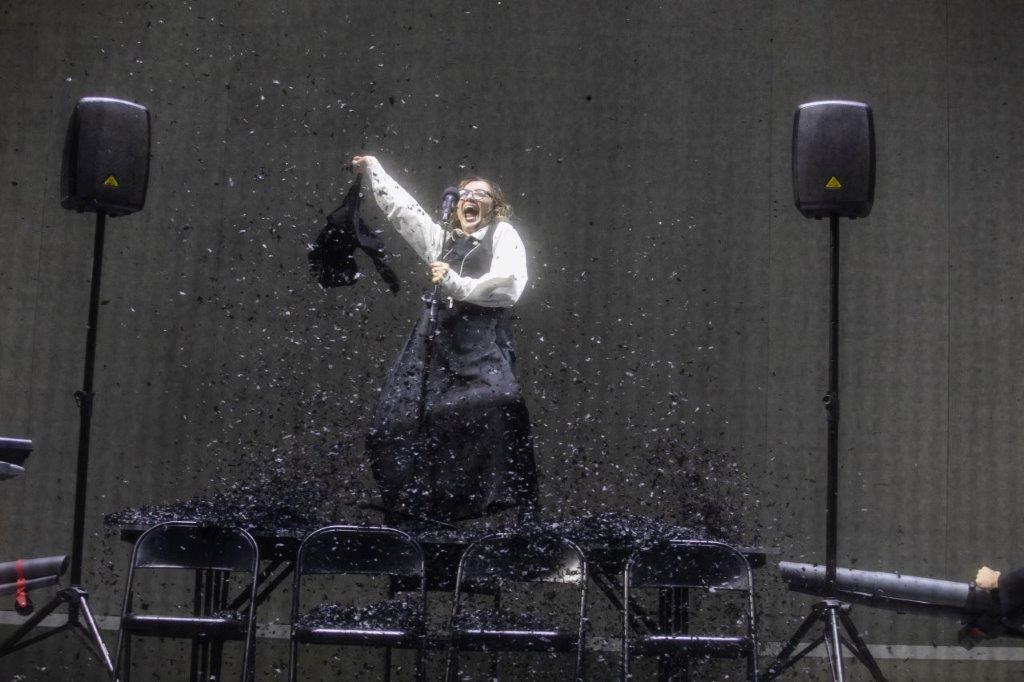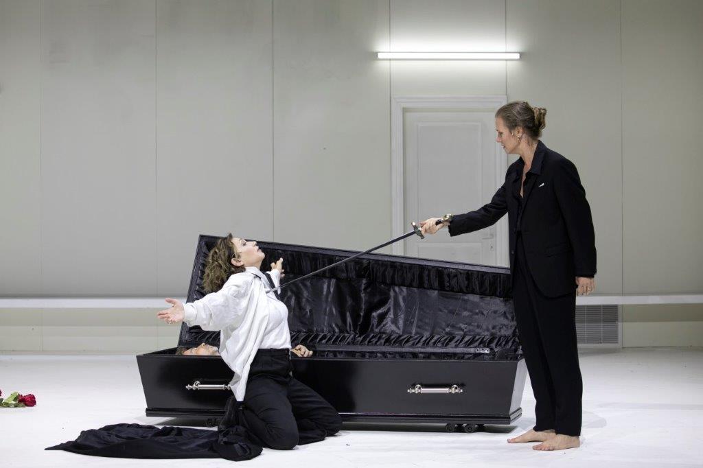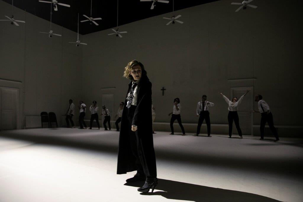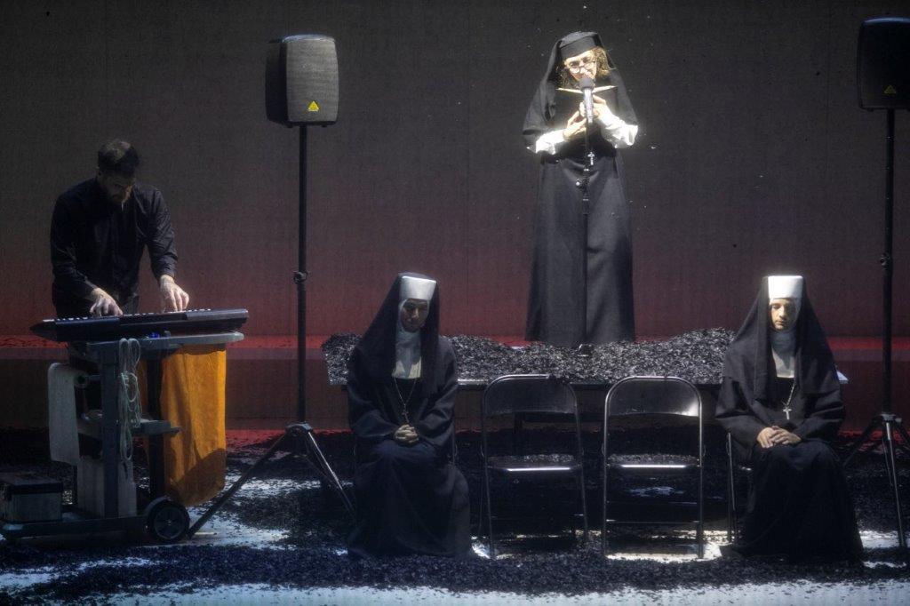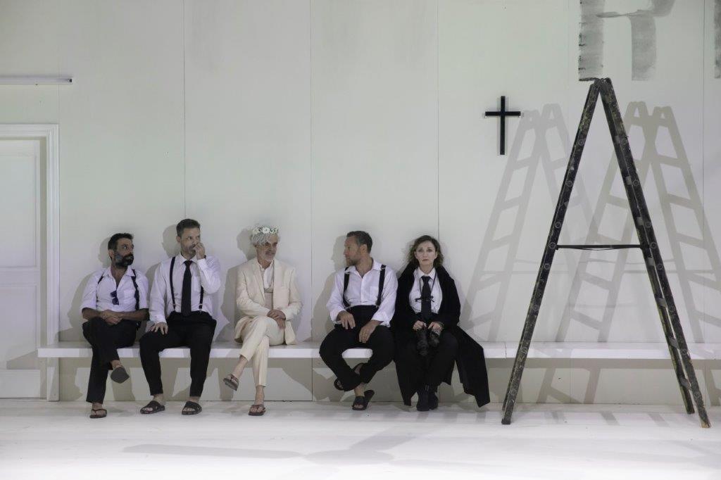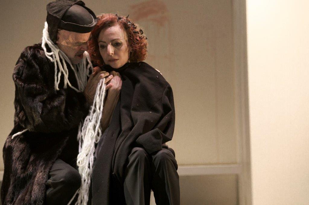 The production juxtaposes throughout these milestones of Israel's national Songbook and presents them with a bitter twist of irony. They are sung on stage almost like church hymns, with an organ accompaniment, which makes them sound weird to Israeli ears – familiar songs in an estranged context, lyrical songs in a bloody atmosphere, idealistic songs distorted. Without adding one line of text to Shakspeare's play, the songs make the production terribly contemporary and mercilessly critical of Israel's present reality.